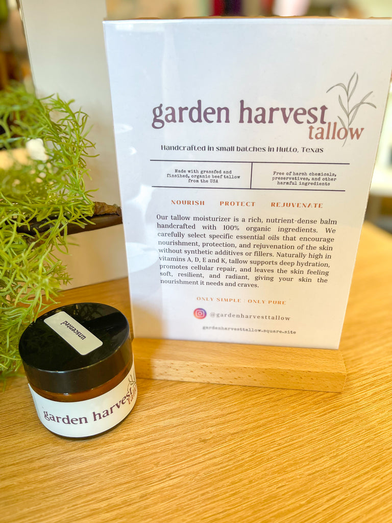 Garden Harvest Tallow moisturizer is a rich, nutrient-dense balm handcrafted with 100% organic ingredients. We carefully select specific essential oils that encourage nourishment, protection, and rejuvenation of the skin without synthetic additives or fillers. Naturally high in vitamins A, D, E and K, tallow supports deep hydration, promotes cellular repair, and leaves the skin feeling soft, resilient, and radiant, giving your skin the nourishment it needs and craves.